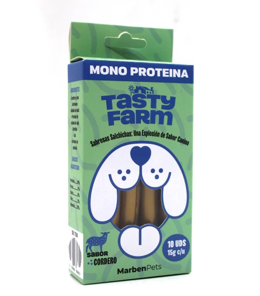 La Caja Snack Salchichas Monoproteica Cordero (TFS04) 15 g de Tasty Farm es un snack natural y saludable diseñado para perros. Elaborado exclusivamente con carne de cordero, es ideal para mascotas con sensibilidades alimentarias o alergias a otras proteínas.